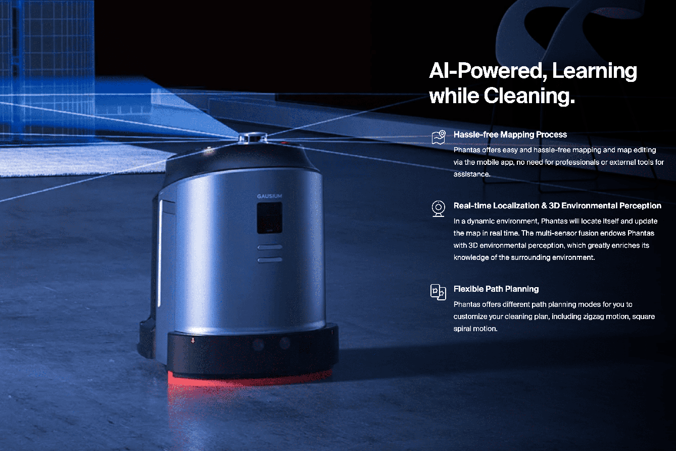 Gausium Phantas kan lokalisere sig selv i realtid, og navigere dynamiske miljøer uden at fare vild. Den er drevet af deep learning AI-teknologi, som gør det muligt for den at genkende forskellige forhindringer og træffe avancerede beslutninger i forhold til, hvordan den skal agere. For eksempel vil den undgå ledninger i stedet for at køre over dem.